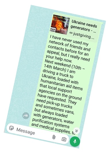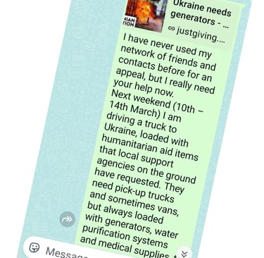 However, it is important that this is worded as a personal appeal for support on your drive to deliver a truck to Ukraine, loaded with humanitarian aid, not just a request for a donation to your nominated charity. You friends and family want to back ‘you’, not just a charity you happen to be supporting.