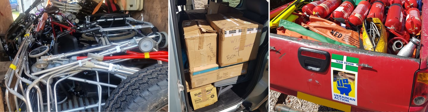 Donated 4x4 vehicles are used for medical and civilian evacuations in front-line areas. They need to be able to traverse destroyed roads and go off-road to avoid drone patrolled routes. All are loaded with aid donated locally in South Devon.